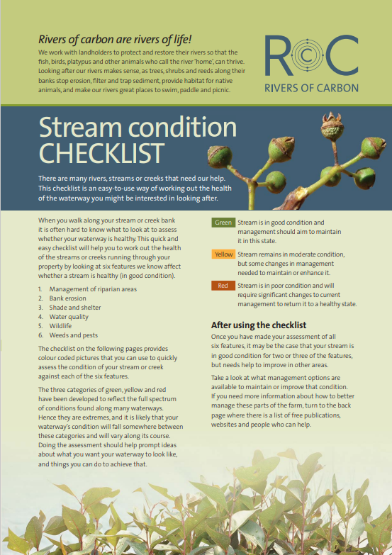 There are several ways to assess waterway condition, we recommend using this simple tool created by the Australian River Restoration Centre – the Stream Condition Checklist.