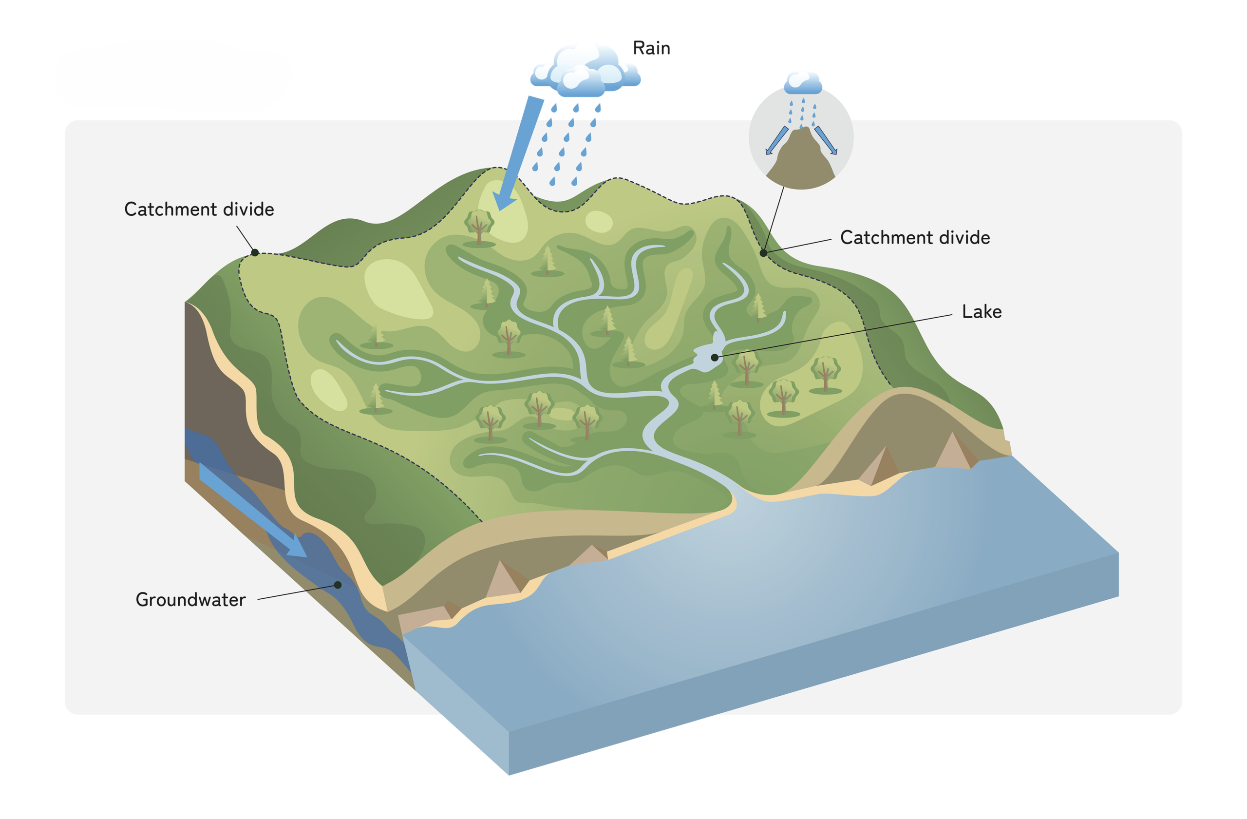 A catchment is the area where water collects when it rains, generally contained by a natural boundary like ridges, hills or mountains. As water flows across the landscape, it enters streams, seeps into the soil, and eventually feeds rivers that flow to the sea. Along the way, it carries materials like boulders, gravel, sand, silt, and clay—shaping the river over time.